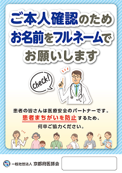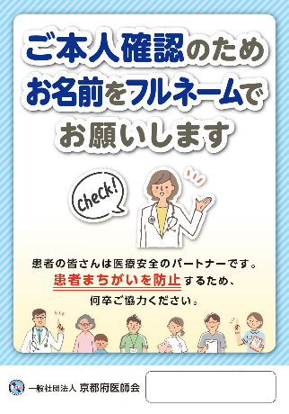 このポスターは、患者さんにお名前を名乗っていただくようご案内する「名乗らせ確認啓発ポスター」です。医院や病院に掲示していただくことで、医療安全活動を積極的に取り組む病院であることを示すことになります。また、実際に名乗っていただくことで、患者誤認の事故を無くすことができます。なおポスターデザインは、男女共同参画の観点からメインイラストが男性医師、女性医師それぞれのデザインを作成しております。